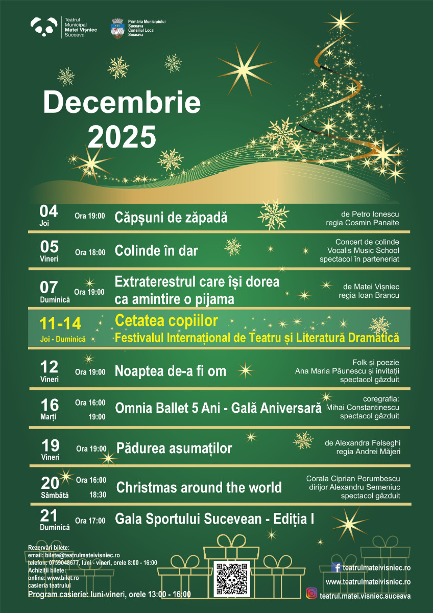 Luna decembrie aduce pe scena Teatrului Municipal "Matei Vișniec" Suceava (TMMVS) un mix de spectacole care îmbină dramaturgia de calitate cu spiritul cald al sărbătorilor. Surpriza acestei luni este Festivalul Internațional de Teatru și Literatură dramatică „Cetatea copiilor” ce se desfășoară în perioada 11-14 decembrie!