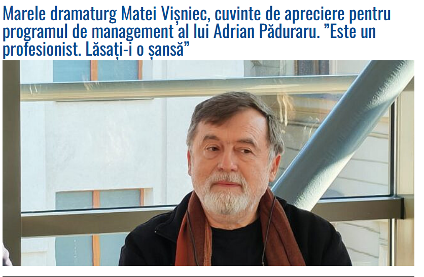 Marele dramaturg Matei Vișniec a avut cuvinte de apreciere la adresa programului de management al actorului Adrian Păduraru, care conduce în prezent Teatrul Municipal ”Matei Vișniec” din Suceava după ce a câștigat concursul organizat de Primărie. Prezent la conferința de presă în care a anunțat premiera spectacolului ”Cabaretul cuvintelor” pe care îl și regizează, Matei Vișniec, a declarat că și-ar dori ca teatrul sucevean să meargă până la capăt cu programul actualului manager subliniind că va fi furios peste cinci ani în cazul în care nu va fi implementat în totalitate. ”Citiți programul care e vizibil, e publicat. Mi-aș dori să mergem până la capăt cu acest program, care înseamnă că va continua teatrul să existe, că va avea bani, că va exista festivalul care a fost deja lansat (nr. Festivalul Internațional ”Zilele Teatrului Matei Vișniec”) dar și alte festivaluri, că vor exista spectacole pentru copii și multe, multe altele. Voi fi furios pe Adrian Păduraru, dacă peste câțiva ani nu-și va fi dus până la capăt programul. Voi fi furios pe Primăria din Suceava peste câțiva ani dacă nu va continua să dea bani pentru teatru. Voi fi furios și supărat mai târziu. Deocamdată faptul că într-un context extrem de problematic pentru cultura română, noi aici avem baza financiară pentru încă o stagiune, pentru alte montări, că s-au angajat patru noi oameni, că s-au angajat în zona tehnică alți oameni. Voi fi furios dacă peste patru ani această clădire nu va fi numai a Teatrului. Pentru că și acest proiect este important. Noi suntem ca în Topîrceanu ”Balada chiriașului grăbit”. Suntem o trupă care stă aici în chirie. Clădirea nu este a Teatrului. Dacă vreți să bateți un cui în perete, trebuie cerut acordul Primăriei. Sunt atâta lucruri ca sunt încă de făcut și voi fi furios dacă ele nu vor fi făcute după cei cinci ani de mandat pe care îl are acum Adrian Păduraru. Chiar și scaunele pe care veți sta dacă veniți la teatru în sală, veți vedea că ele nu sunt un simbol al teatrului, sunt un simbol al industriei de divertisment. Sunt scaune făcute să vii să te întinzi, să pui sticla de coca-cola sau punga cu chipsuri, sau mai știu eu ce și să stai așa să mai înghiți câte o chestie și te uiți ca un film. Nu sunt scaune de teatru. Sunt încă atât de multe lucruri de făcut. Printre altele și esențial este ca nouă din cei 10 actori să poată fi angajați definitiv, pentru că sunt într-o stare de precaritate. Adică au contracte care se reînnoiesc peste un an ceea ce eu cred că nu e normal după 10 ani, după 9 ani de activitate. Este o altă misiune, o altă datorie pe care consider că Adrian Păduraru trebuie să o aibă. Să stabilizeze nu numai niște vieți, dar niște talente care s-au format aici, care sunt cunoscute aici. Pot să continui mai departe cu lucrurile care mă vor face foarte furios, dar peste patru ani, dacă nu vor fi realizate. Acum prefer să vorbesc despre ce-mi doresc eu pentru acest oraș, pentru acest teatru, pentru această echipă, pentru cultură”, a declarat Vișniec. El a ținut să precizeze că fără factorul politic, nu se poate face cultură în România mai ales în provincie întrucât factorul politic gestionează bugetele iar fără bugete care să fie credibile, nu se poate face cultură. ”Acum, factorul politic l-a pus în această funcție pe Adrian Păduraru. Este un profesionist. Lăsați-i o șansă”, a încheiat marele dramaturg.