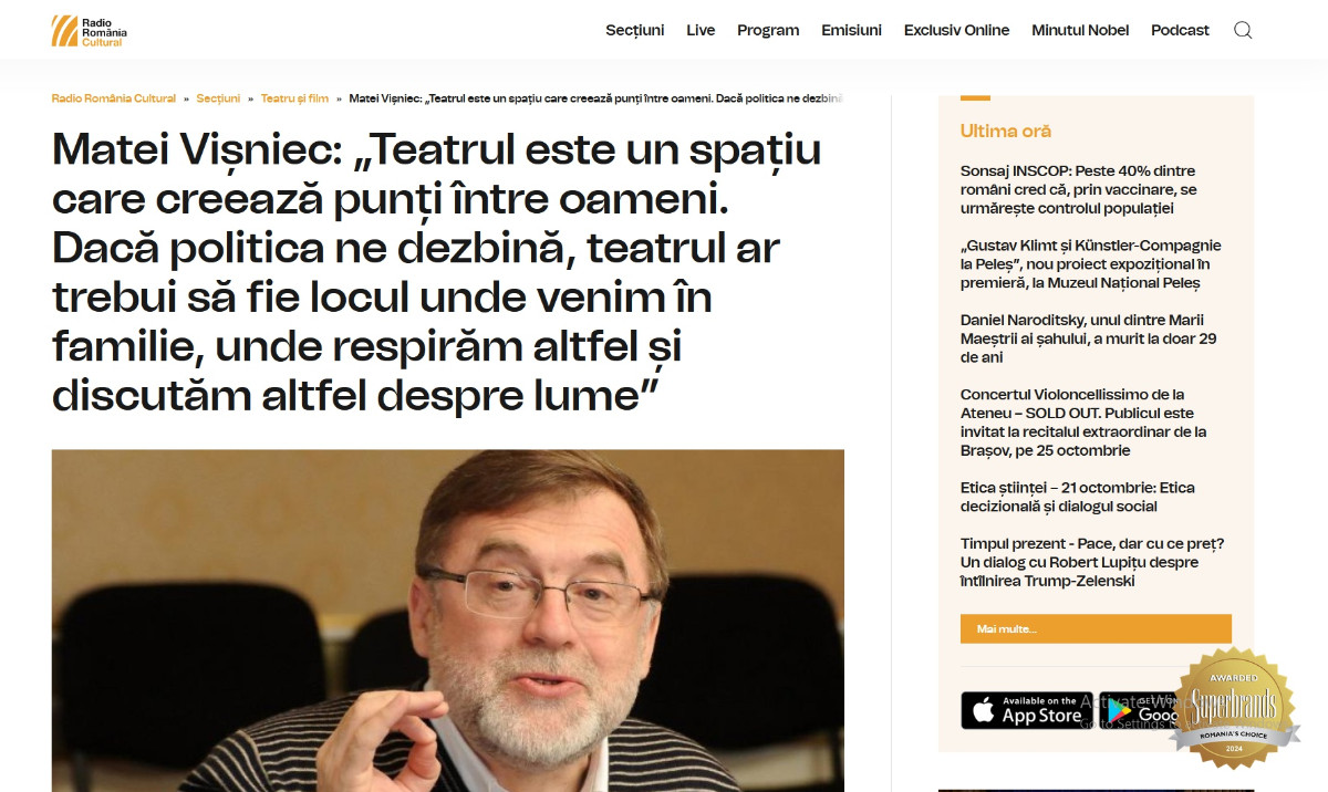 • Matei Vișniec: „Teatrul este un spațiu care creează punți între oameni. Dacă politica ne dezbină, teatrul ar trebui să fie locul unde venim în familie, unde respirăm altfel și discutăm altfel despre lume”