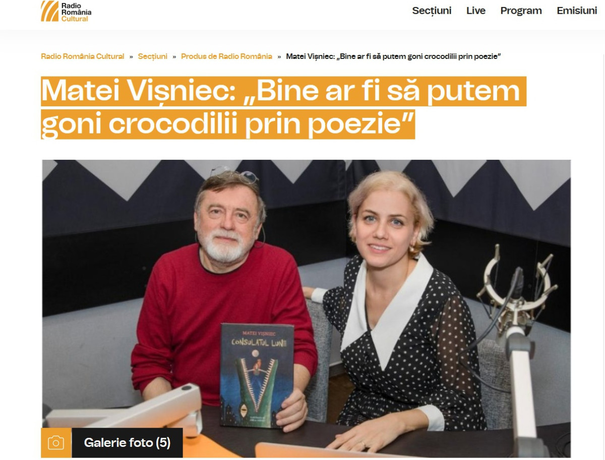 Prezent în România pentru aniversarea a 10 ani de existență a Teatrului Municipal Matei Vișniec din Suceava, cu premiera spectacolului Cabaretul cuvintelor, unde semnează și regia, și pentru lansarea cărții Consulatul Lunii sau Adelina și crocodilii de mlaștină (Editura Humanitas Junior), Matei Vișniec a fost astăzi invitatul Dariei Ghiu în emisiunea Orașul Vorbește.