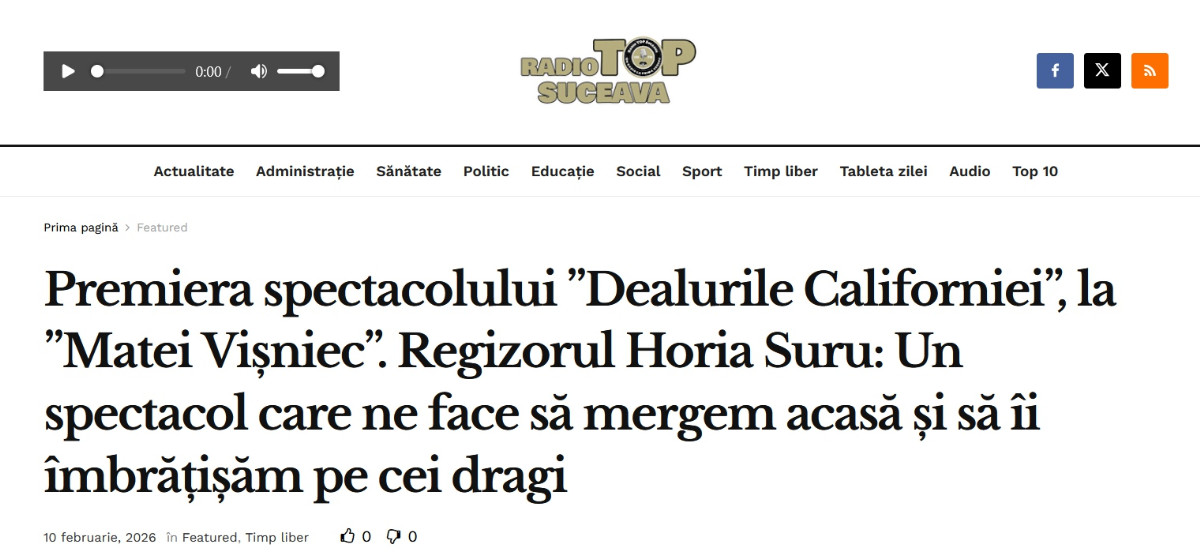 Regizorul Horia Suru consideră că spectacolul ”Dealurile Californiei” merită de vizionat pentru că este vorba despre o poveste frumoasă. Spectacolul va avea premiera la Teatrul Municipal ”Matei Vișniec” Suceava pe 14 februarie, începînd cu ora 19.00.