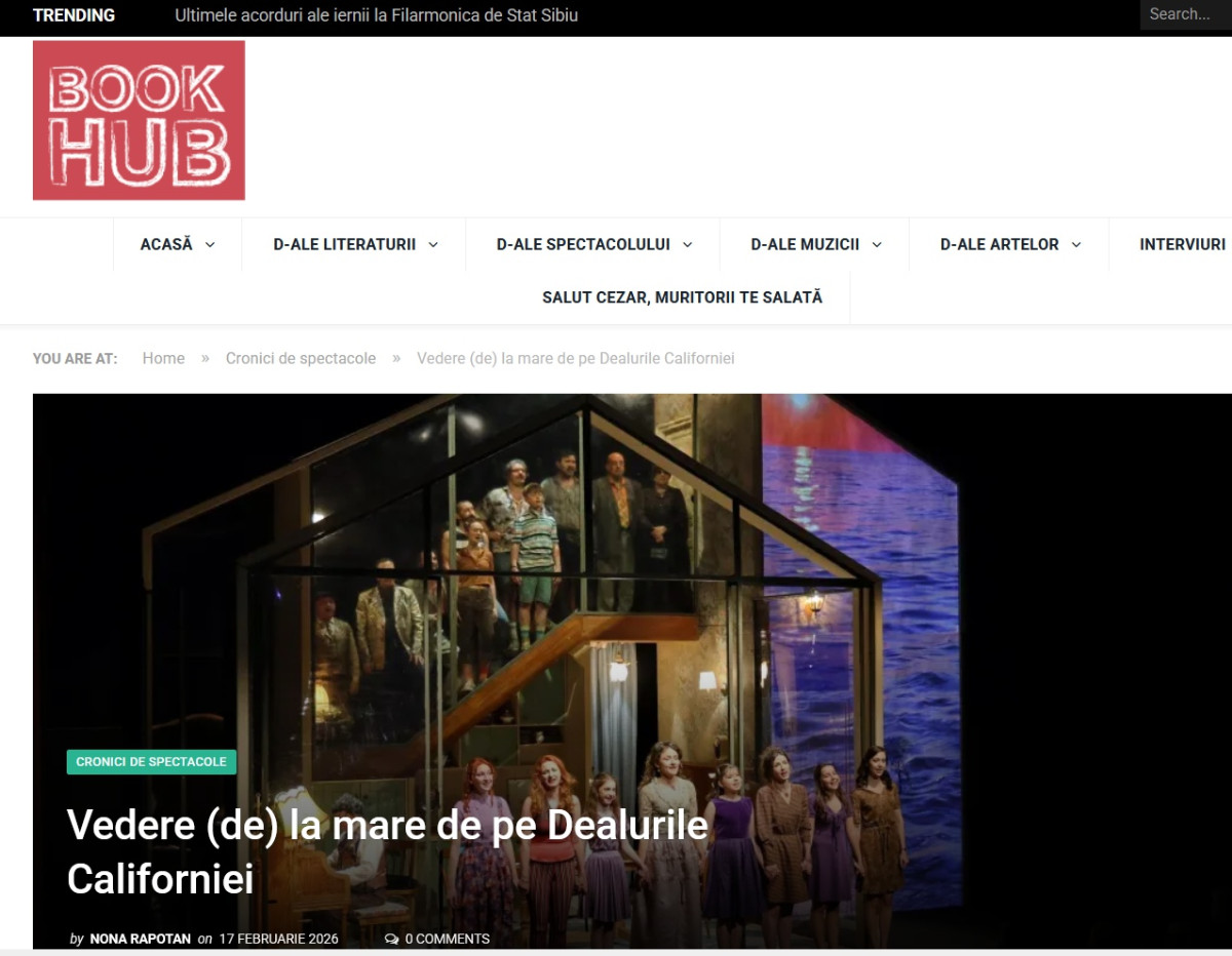 Din felul cum sunt scrise piesele de teatru, îți dai seama că Jez Butterworth iubește, la fel de mult, (și) filmul. Piese elaborate, cu multe personaje (toate importante din punct de vedere dramaturgic), cu povești originale, născute în urma unor perioade de documentare serioasă. The Ferryman s-a jucat pentru prima oară în 2017, pe scena Royal Court Theatre, West End; The Hills of California s-a jucat în premieră absolută în 2024, la Harold Pinter Theatre, West End. Ambele piese au fost montate de Horia Suru – premiere naționale absolute – pentru Teatrul Clasic Ioan Slavici Arad (Luntrașul, despre care am scris aici și aici), respectiv Teatrul Municipal „Matei Vișniec” Suceava. (Dealurile Californiei, care a avut premiera în 14-15 februarie 2026). N-o să mă rezum la recomandarea de a vedea celor două spectacole și fiindcă despre Luntrașul am scris deja, o să insist acum pe premiera teatrului sucevean.