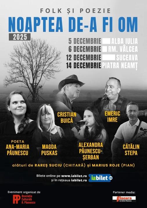 După premiera din iarna anului trecut, spectacolul de muzică folk și poezie „Noaptea de-a fi om” vine în orașul dumneavoastră și vă invită la câteva ore în care viața se va scurge altfel, în care ochii se vor privi în oglindă și se vor înțelege. Acorduri sincere de chitară, muzică folk pe care o știți pe dinafară și cântece noi, toate printre poezii care abia așteaptă să fie descoperite. Dați o șansă culturii adevărate, în luna decembrie a lui 2025.