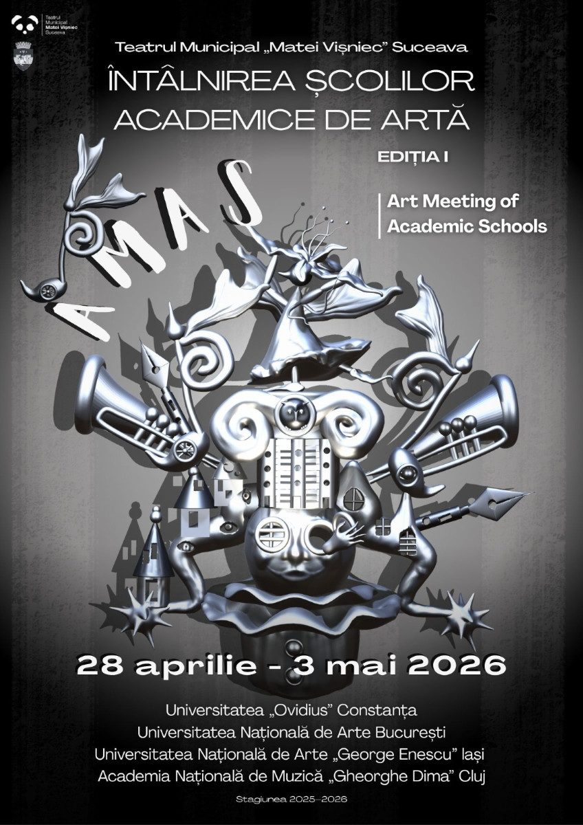 Prima ediție a Întâlnirii Școlilor Academice de Artă are loc la Suceava, în perioada 28 aprilie – 3 mai 2026 și se desfășoară sub îndrumarea cunoscutului actor, conf. univ. dr. Paul Chiribuță. Anul acesta, invitații AMAS sunt: Universitatea Națională de Arte București, Universitatea Națională de Arte „George Enescu” Iași, Universitatea „Ovidius” Constanța și Academia Națională de Muzică „Gheorghe Dima” Cluj- Napoca.
