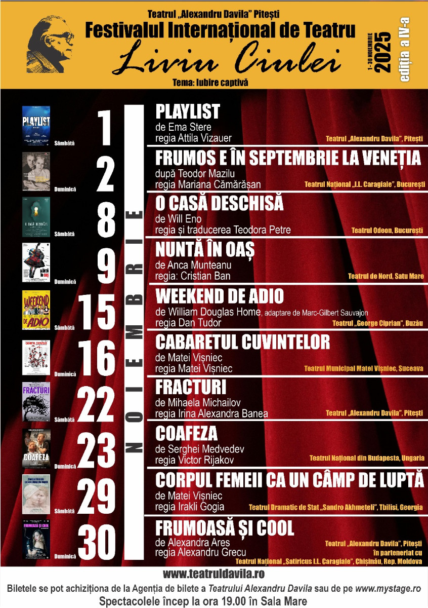 La sfârșitul săptămânii, Teatrul Municipal „Matei Vișniec” Suceava este invitat la Pitești, în cadrul Festivalului Internațional de Teatru „Liviu Ciulei”, aflat la cea de-a IV-a ediție. Cabaretul cuvintelor este programat pe 16 noiembrie în sala mare a Teatrului Alexandru Davila, iar biletele se pot achiziționa online https://www.mystage.ro/spectacole/cabaretul-cuvintelor-4963/date/41018