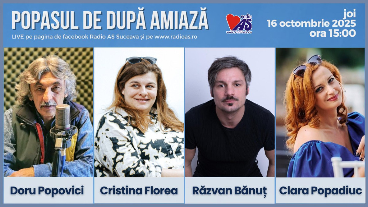 În cadrul emisiunii „Popasul de după amiază” de joi, 16 octombrie 2025, de la ora 15:00, Doru Popovici îi are ca invitați pe Cristina Florea, Clara Popadiuc și Răzvan Bănuț, actori ai Teatrului Municipal „Matei Vișniec" Suceava.